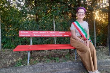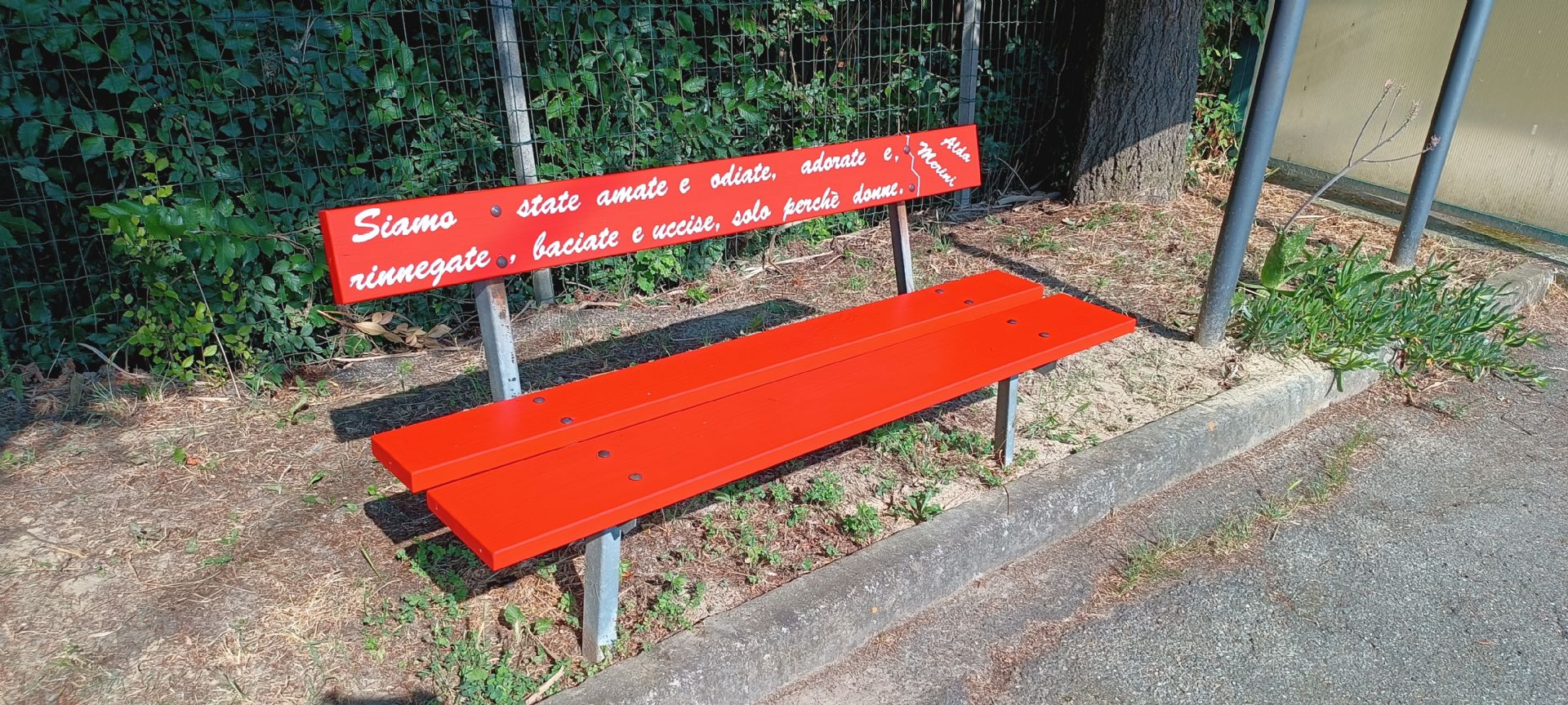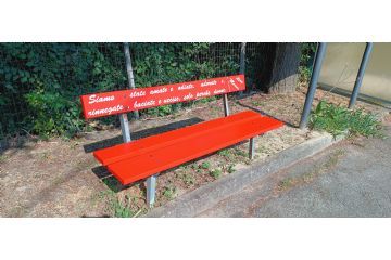 Per questo scopo la panchina è stata dipinta di Rosso acceso e sullo schienale sono state riportate le parole:
