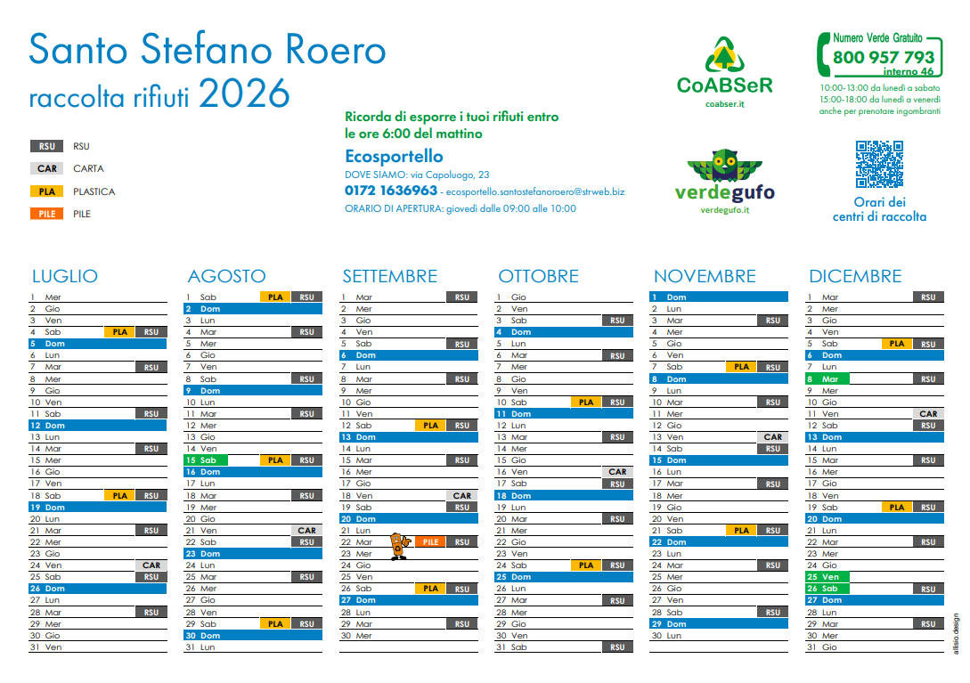I calendari della RACCOLTA RIFIUTI per l'anno 2026 saranno consegnati a domicilio.