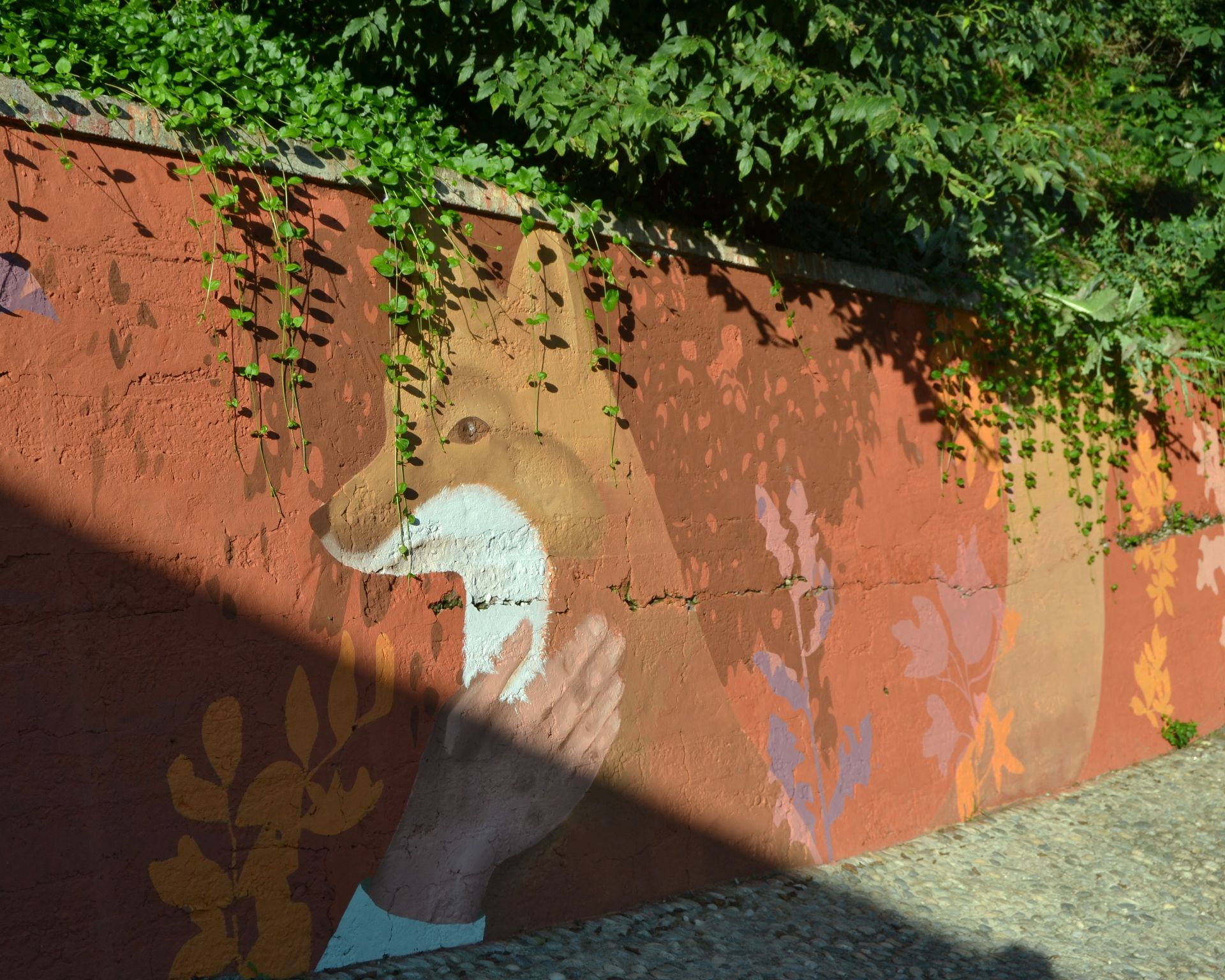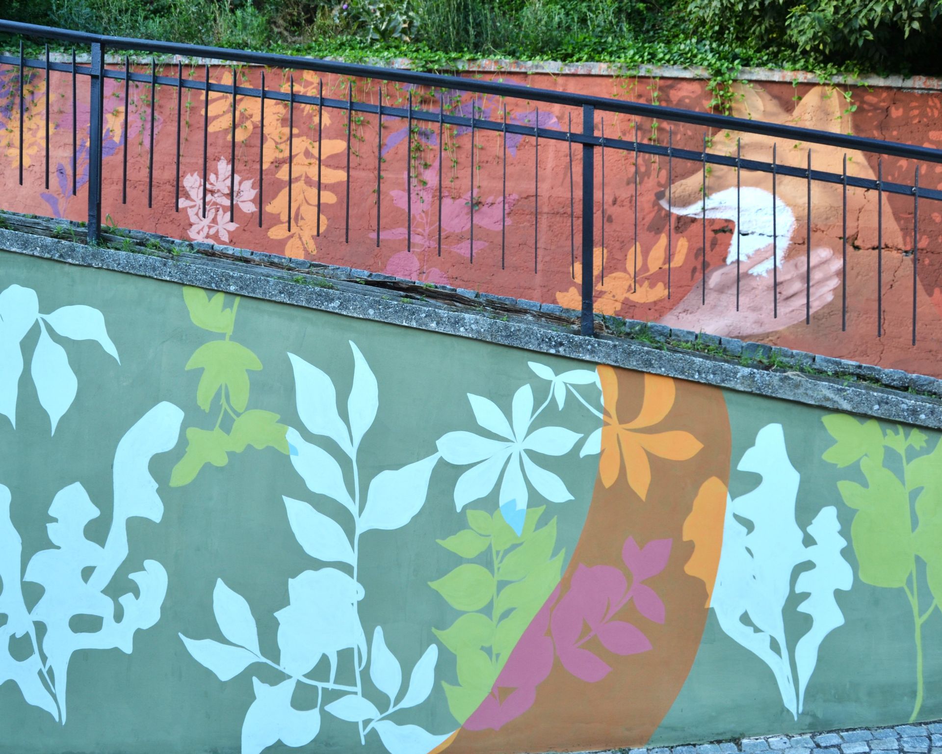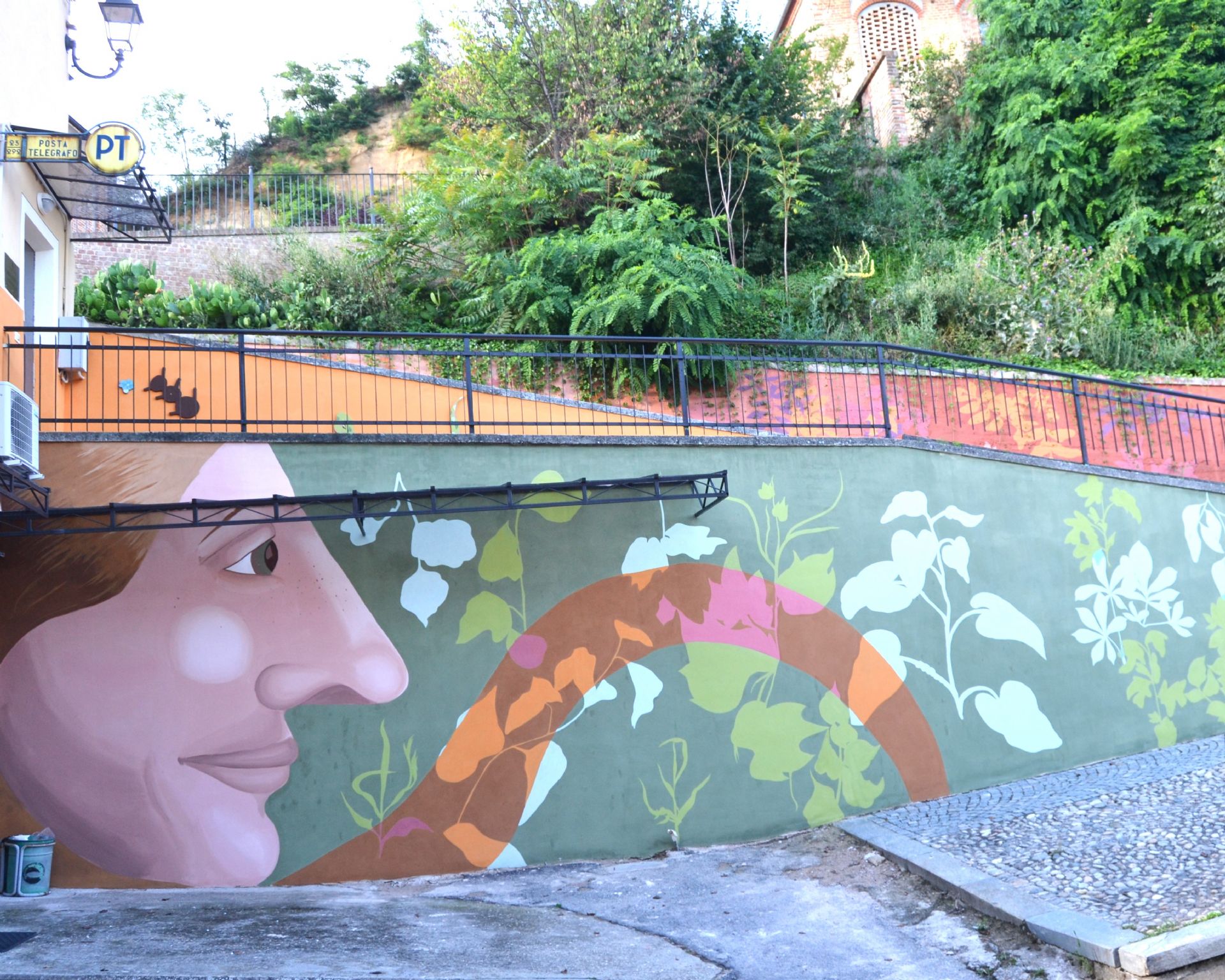 Il dipinto murario mostra la figura tradizionale della “masca” riletta in un’ottica nuova, ovvero come personaggio femminile custode del patrimonio naturale.