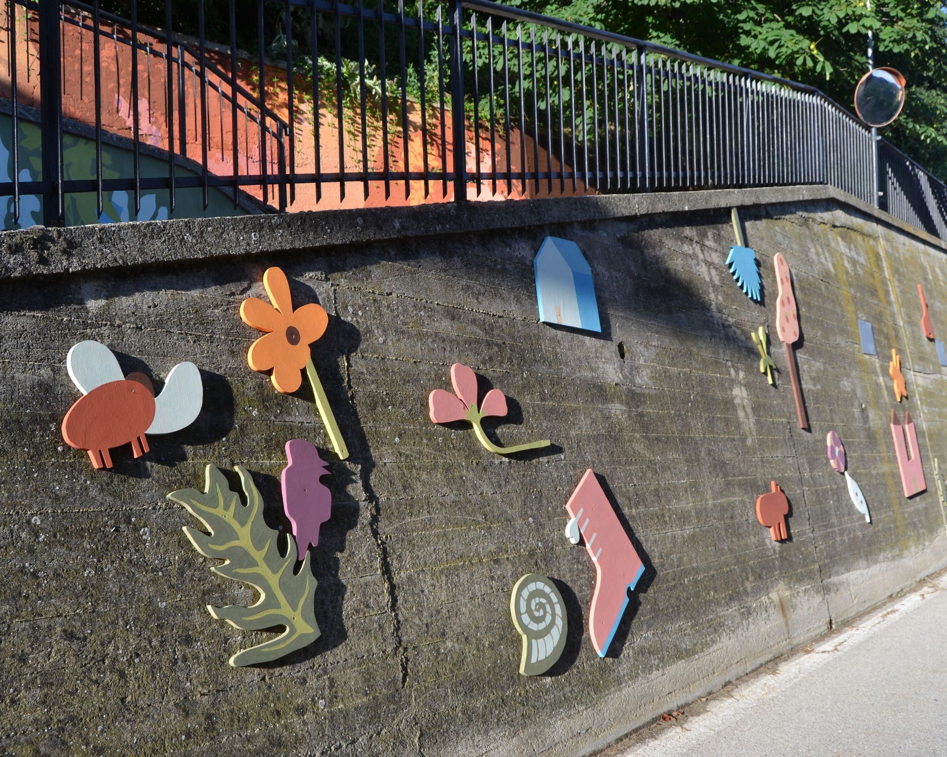 A complemento delle rappresentazioni principali, che campeggiano sui tre muraglioni superiori, sono state applicate sul muraglione più basso, lungo la strada provinciale, una serie di formelle in legno realizzate a partire dai disegni dei bambini.