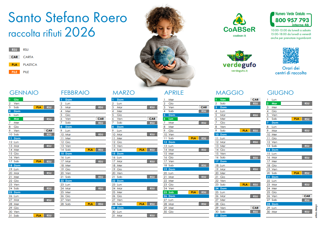 I calendari della RACCOLTA RIFIUTI per l'anno 2026 saranno consegnati a domicilio.